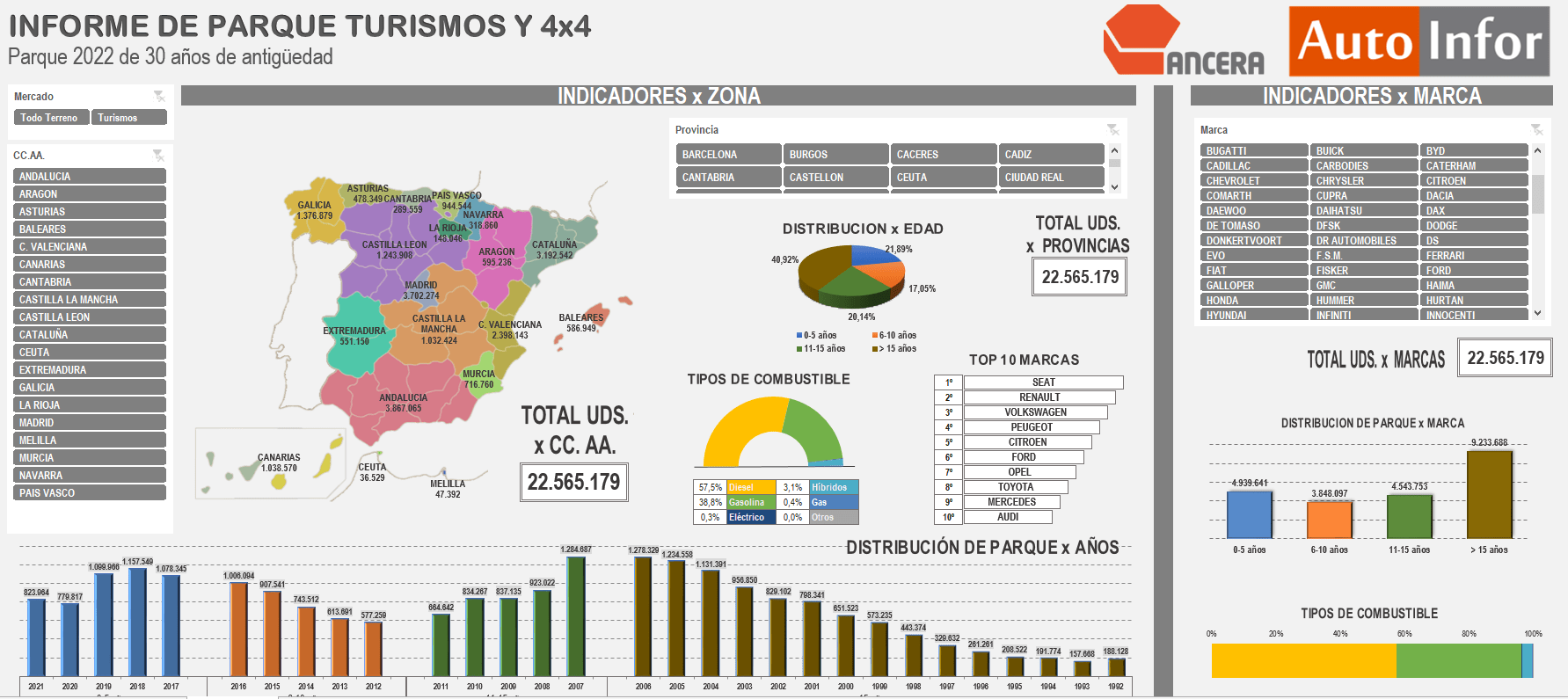Esta herramienta, elaborada gracias a la colaboración con AutoInfor del panel de control sobre el parque de vehículos de turismo y todoterrenos que circulan por nuestras carreteras, permite filtrar por marca o por provincia y ver qué vehículos circulan y en qué tramos de edad por vuestra zona de influencia.