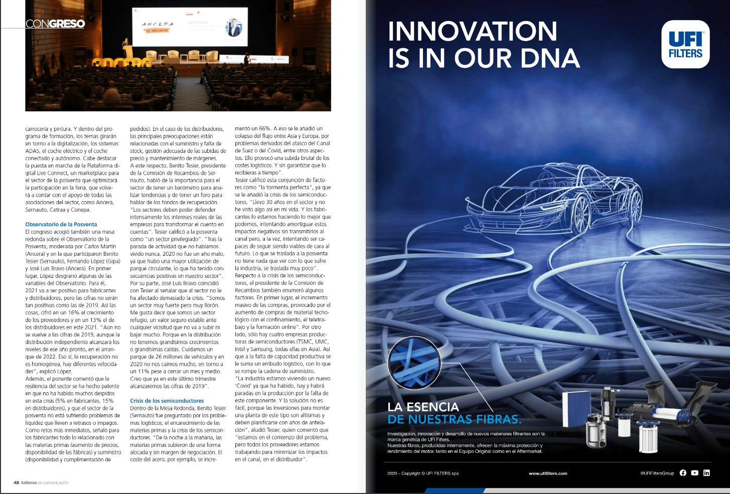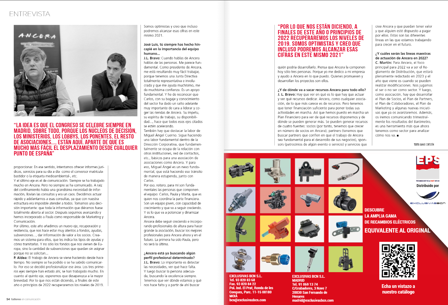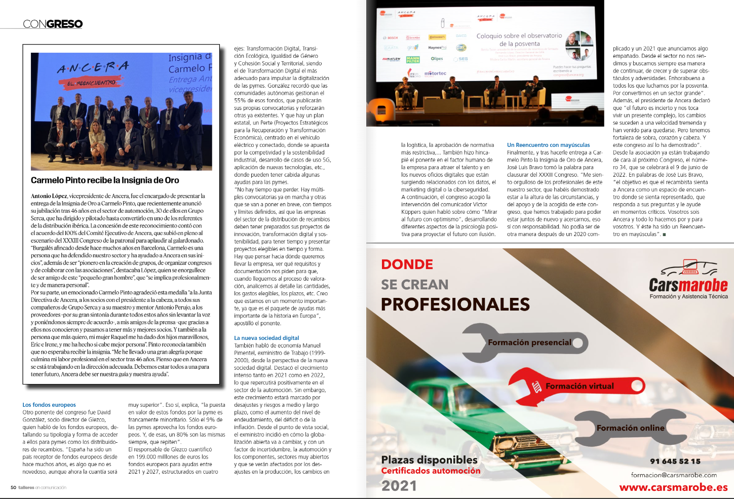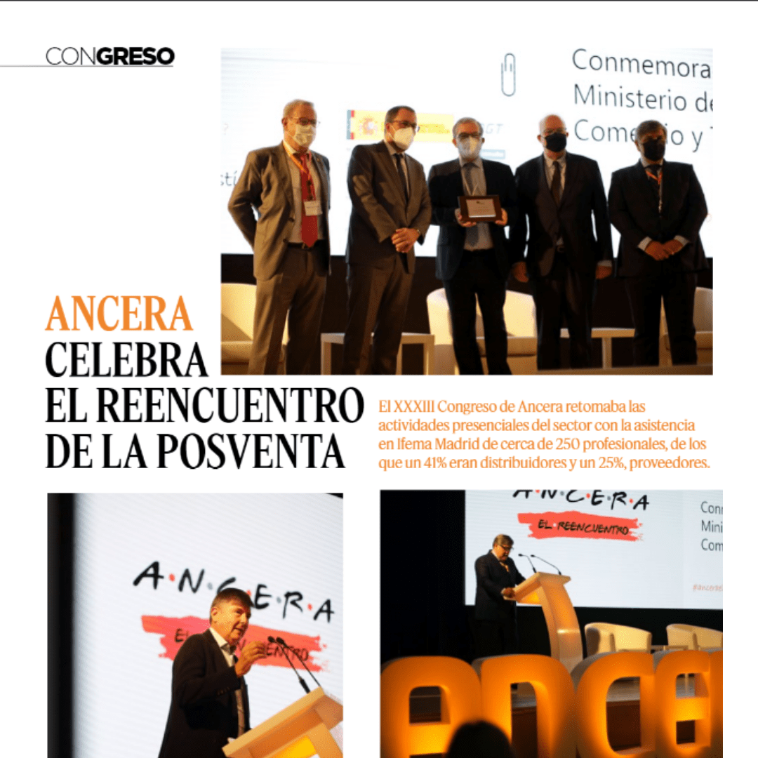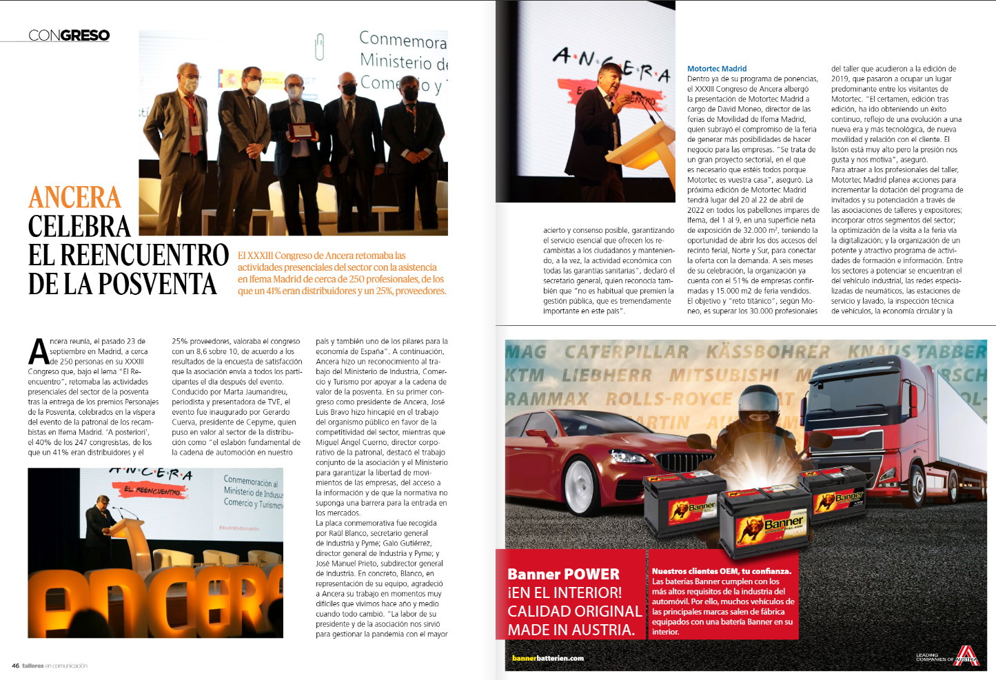 La revista Talleres en Comunicación acaba de publicar su número 291 donde ANCERA es protagonista, destacando la organización de su XXXIII Congreso. La cabecera de la posventa ha recalcado la puntuación de los asistentes, cerca de 250 congresistas, de “un 8,6 sobre 10” a la cita presencial realizada el 23 de septiembre y, a la vez, hace un repaso a lo largo de las 5 páginas del reportaje de los contenidos del Congreso, centrándose en la presentación del Observatorio de la Posventa, realizado en colaboración con Sernauto, con los datos recogidos de GIPA.